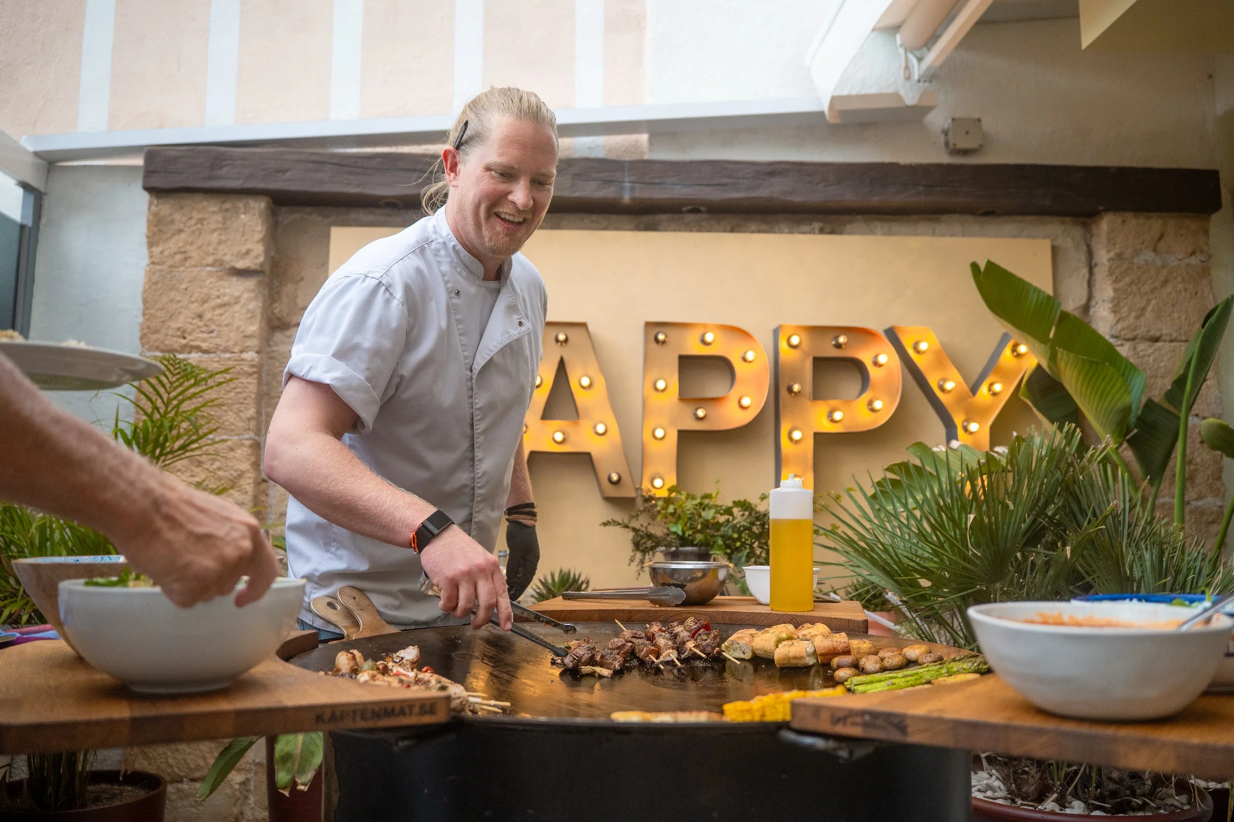 Johan is grilling skewers, vegetables, potatoes och garlic bread out on the terrace, and this comes with delicious sauces as well! 35€/p